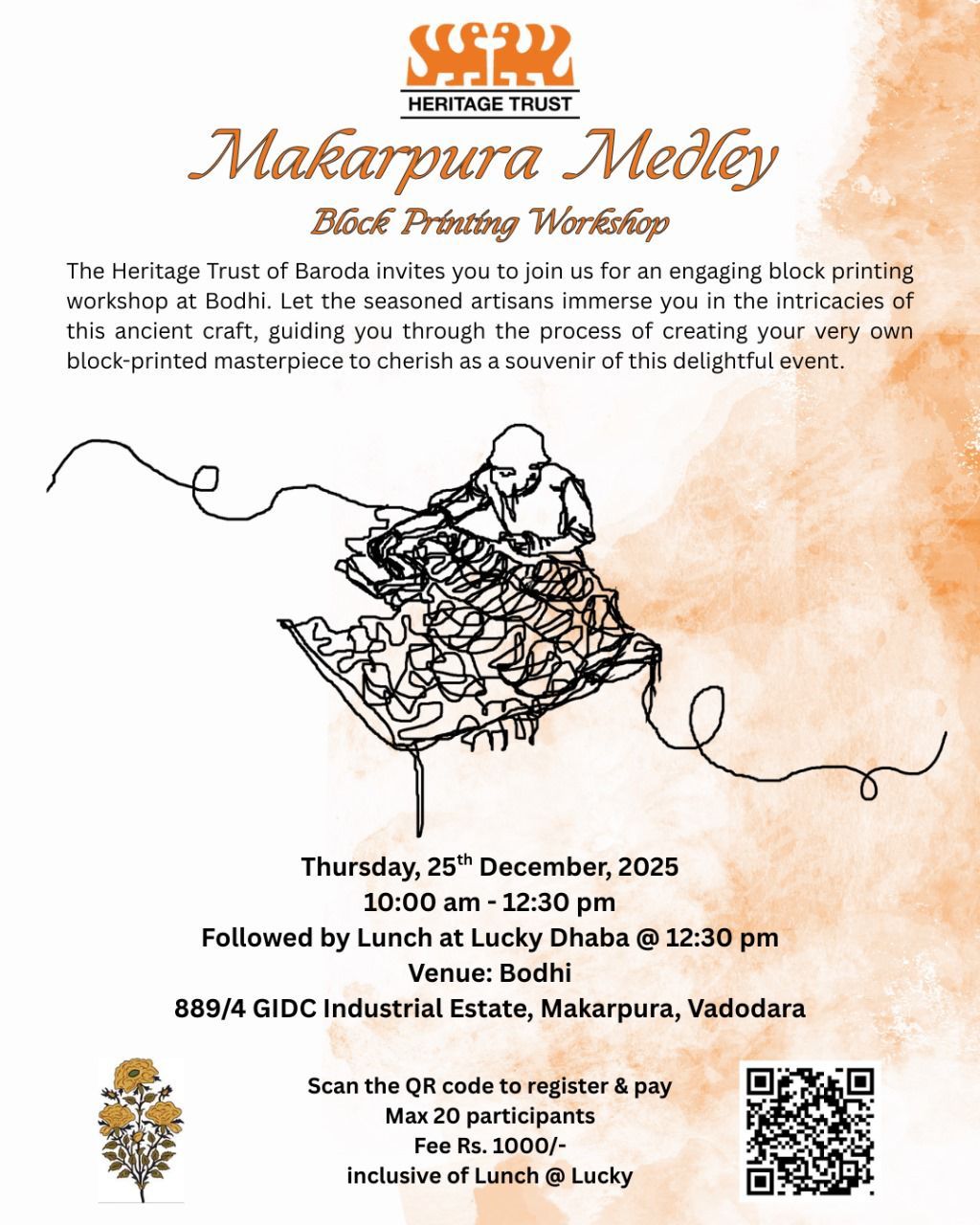 The Heritage Trust of Baroda invites you to join us for an engaging block printing workshop at Bodhi. Let our seasoned experts immerse you in the intricacies of this ancient craft, guiding you through the process of creating your very own block-printed masterpiece to cherish as a souvenir of this delightful event. Don’t miss out on this opportunity to have fun while learning something timeless.