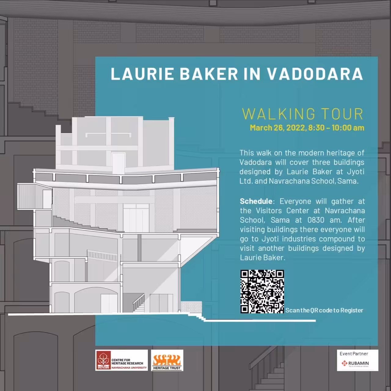 WALKING TOUR March 26, 2022, 8:30 - 10:00 am This walk on the modern heritage of Vadodara will cover three buildings designed by Laurie Baker...