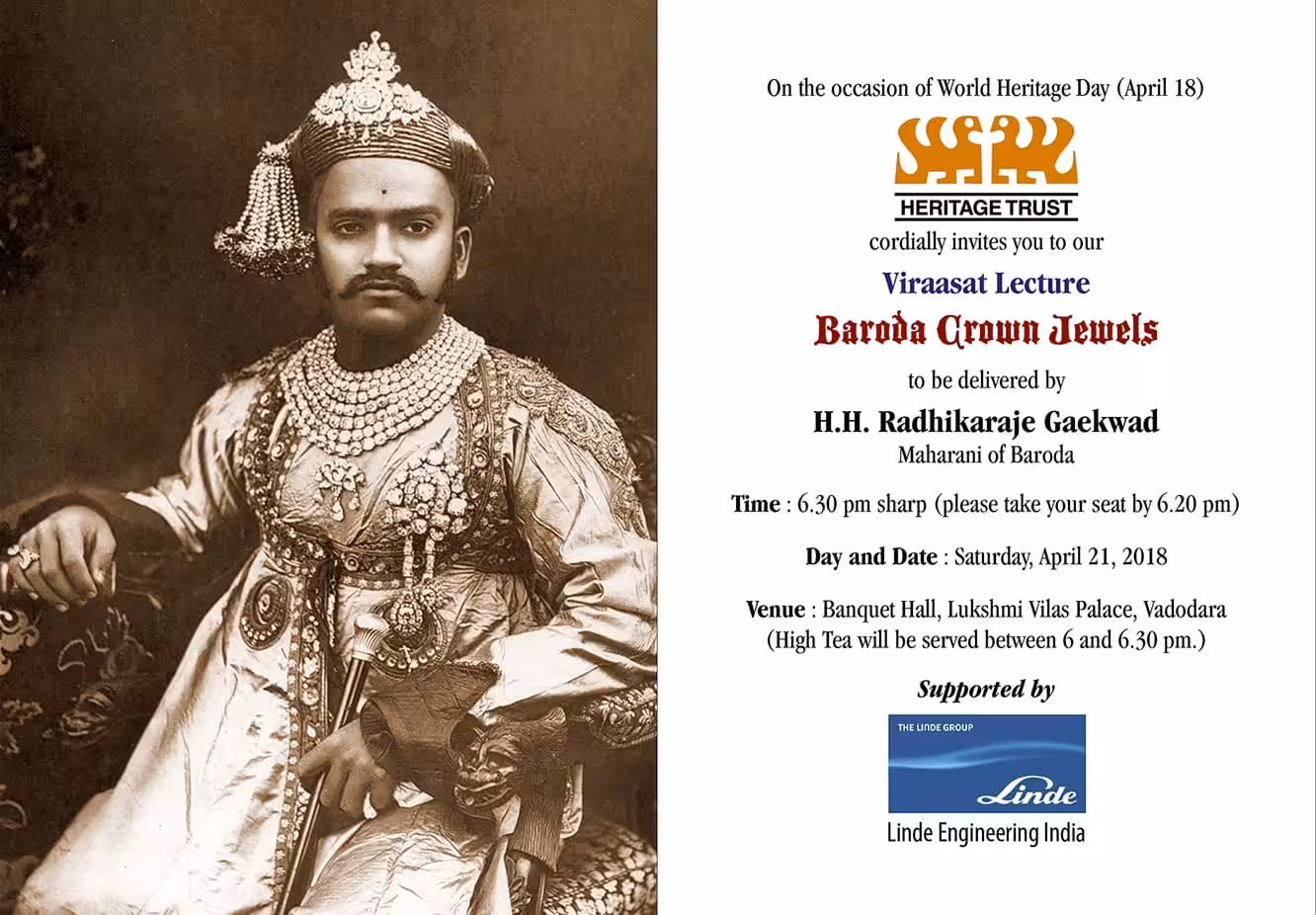 Viraasat Lecture Baroda Croun Jewels to be delivered by H.H. Radhikaraje Gaekwad Maharani of Baroda Time: 6.30 pm sharp (please take your seat by 6.20...