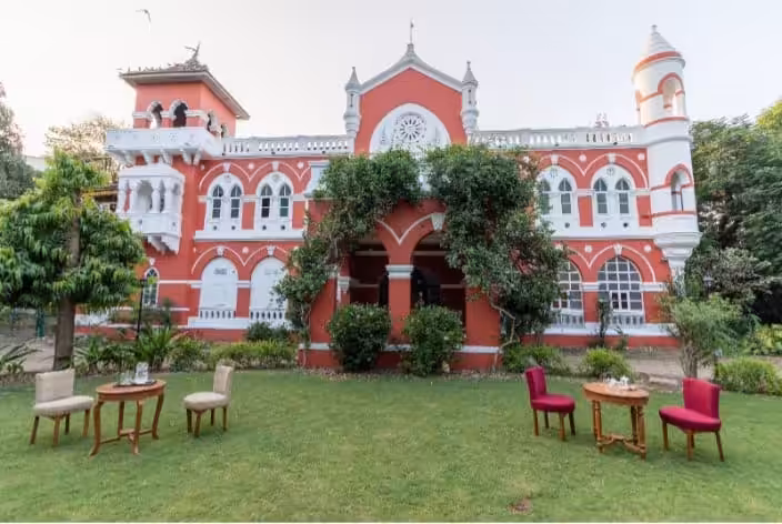 Built in 1892 in the Indo-sarcenic style possibly under the guidance of the architect Robert Chisholm (the architect of the Laxmi vilas palace,) on 1.5 acres of land, Madhav Bagh is an example of the architecture of that time. It boasts of an impressive red and white façade and the building is complete with arches and spires, motifs and carvings and Gothic turrets and jharoka style balconies. Indo-sarcenic architecture is a revival architectural style used by the British in the late 19th century for government and public building and palaces in the princely states during the British Raj. This synthesis of Mughal – Indo architecture was also an effort by the British to display that despite being an Imperial power, the British in India were a part of the Indian milieu. Yet this mixture of architecture remained British in spatial organization and composition as seen in the Laxmi Vilas Palace.